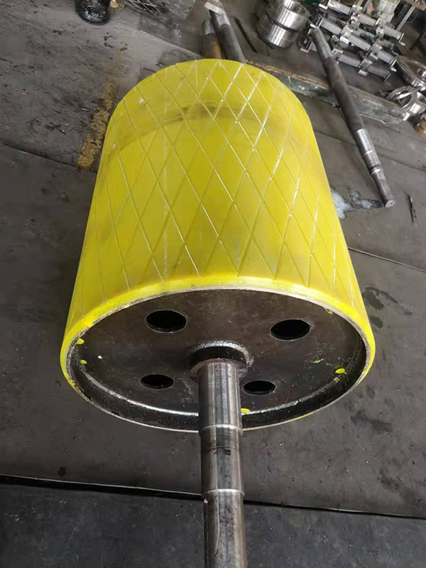 傳動包膠滾筒表面有包膠裸露光鋼面,人字形和菱形花紋橡膠覆面,小功率,小帶寬及環(huán)境干燥時可采用裸露光鋼面滾筒,人字形花膠面摩擦系數(shù)大,防滑和排水性好。但有方向性,菱形膠面用于雙向運動行的輸送機,用于重要場合的滾筒,采用疏化橡膠覆面。